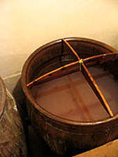 酢は熟成室の甕で、最後の6ヶ月間静かに熟成されていきます。2ヶ月に1度、上澄みと粕を分けるため、甕から甕へ移し変えます。この時空気に触れることで、よりまろやかさが増していきます。